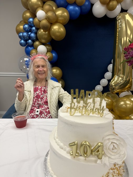 Senior community celebrates 104-year-old resident Pearl Tomlinson smiling with her birthday cake. Photo courtesy of Jennifer Zwolinski. Pearl Tomlinson celebrated turning 104 with friends and family.