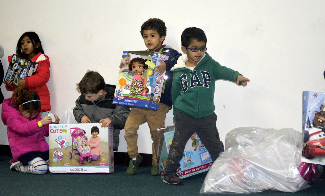 On Thursday, 40 coat-bundled 3- and 4-year-olds bounced off of Carrington Academy buses, arms laden with gifts for foster children their age or younger.