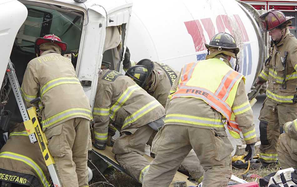 The single-vehicle wreck occurred about 2:40 p.m. as the truck was turning from McGinnis Ferry onto McFarland. The top heavy truck overturned onto the driver's side, trapping the driver, who was alone in the truck, inside.
