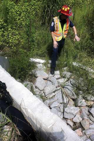 Hazmat booms made of materials used for absorbing carbon-based substances were placed along the tar’s prospective route to catch it and separate it from water from the sewer on its way to the pond.