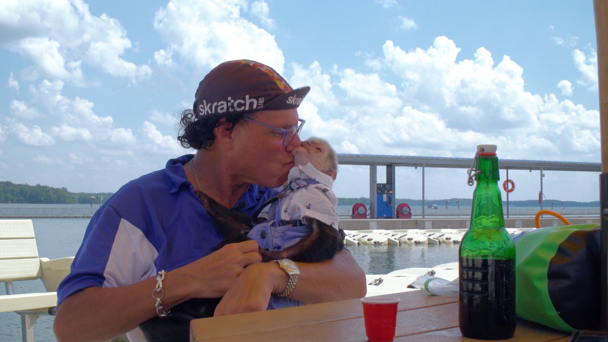 As Manheim walks on the bow, leaning over to apply two new decals to his Porsche GTS, people nearby start to notice the white-faced, black-haired capuchin monkey on his back. He knows they will. Someone always does. Over 22 years of bringing this primate named Dr. Irving with him to everything from hospitals and schools to birthday parties and TV shows, Manheim understands the novelty others see in their pairing. To the gawkers, they are a walking photo-op. A man wearing an Atlanta Falcons hat diverts from where he’s going and walks over to Manheim, pulls out his cell phone and takes a picture. Click. Two men walking by stop in their tracks. Click.