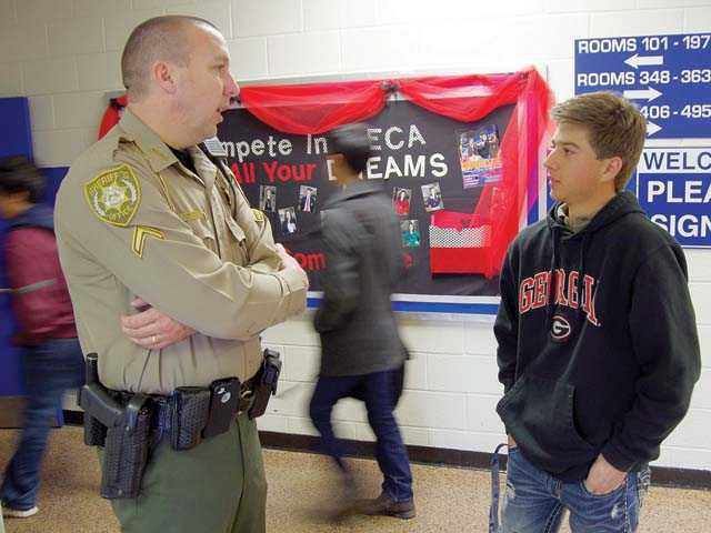 Steve Honn’s eyes darted across the halls of South Forsyth High School on a recent morning while he chatted with a teacher about a class assignment.Students shuffled between class periods, laughing with each other and waving at friends.Most didn’t even glance twice at the tall man with a badge and a gun secured in its holster, though a few said “hello.”South Forsyth has become accustomed to the presence of a Forsyth County Sheriff’s deputy, since a school resource officer has patrolled the campus for about 15 years, when the partnership program began.Two weeks ago, however, the unit expanded from seven to 14, which allows for one officer at each high school and middle school, with roaming patrols at neighboring elementary schools.Each half of the county also has a sergeant overseeing the deputies and schools in that area, for a unit total of 16 people.The increased school presence was announced within Sheriff Duane Piper’s first two weeks in office, which began in January.Sgt. Eric Silveus said the deputies promote a safe environment, enforce laws and provide a link to the sheriff’s office for students, parents and faculty.“Our kids shouldn’t be afraid to come to school,” Silveus said. “We want them to feel safe.”South Forsyth senior Drew Schmidt said having a resource officer at his school reinforces the feeling that campus is a safe place.During his class period working in the front office, Schmidt sees Honn as a helpful source, greeting people and talking to students.A school resource officer does more than protect and patrol.Silveus said each officer acts in several different sheriff’s office capacities within a school, which with about 3,000 people can feel “like its own little town.”The deputy also creates a connection and comfort with law enforcement for students, he said.“It helps us bridge the gap,” Silveus said. “A lot of times within the community, there are walls built up between kids nowadays and police officers.”Deputy Adam Campbell, one of the recently added school resource officers, likes to eat with students in the Lakeside Middle cafeteria to establish that relationship.“But it’s hard to eat because I get so many questions from the kids,” Campbell said.