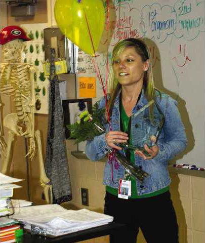 The congratulations started at Mashburn Elementary with first grade-teacher Kim Lochbaum.