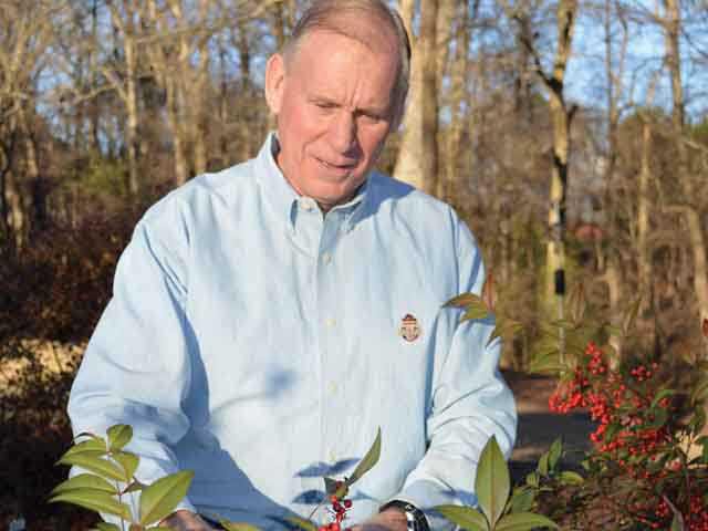 Master Gardener Bill Roper inspects berry bushes on his property. Roper believes in using chemical-free ways, such as this owl statue, to deter animals that eat his plants.