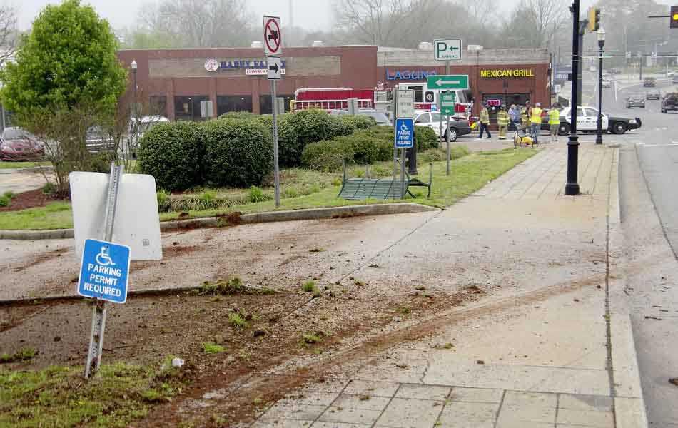 Along the way, the vehicle traveled onto the sidewalk beside the old Forsyth County Courthouse, running over a park bench.