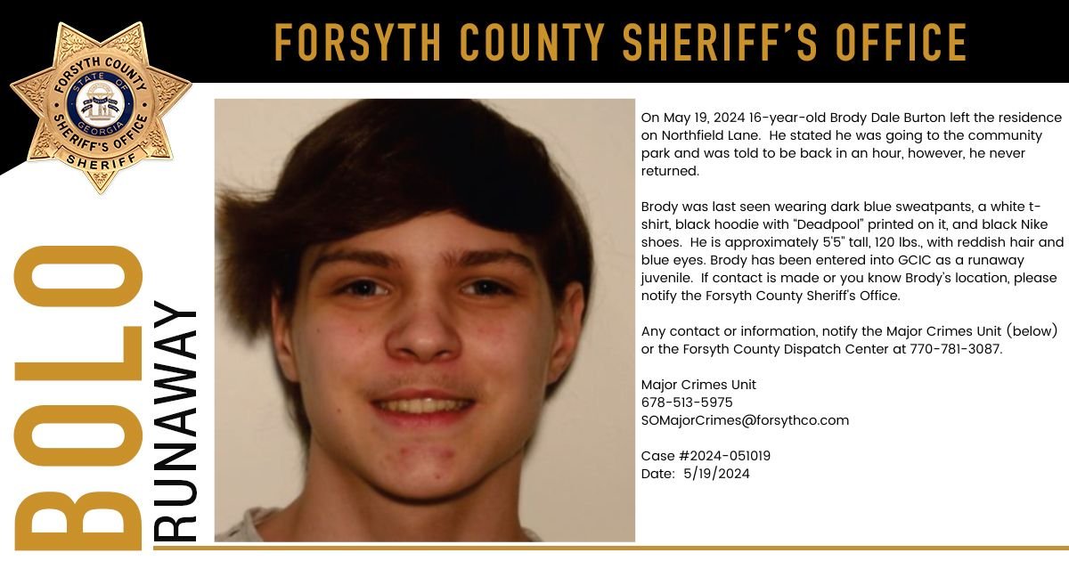 public’s help in finding a runaway juvenile, Brody Dale Burton. Anyone with information should contact the FCSO Major Crimes Unit at 678-513-5975 or SOMajorCrimes@forsythco.com or the Forsyth County Dispatch Center at 770-781-3087.