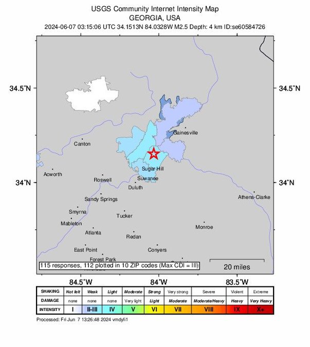 The U.S. Geological Survey reported a 2.3 magnitude earthquake rumbled through the Buford and Lake Lanier area Thursday night. The shaking was rated "very weak" in Cumming, by USGS.