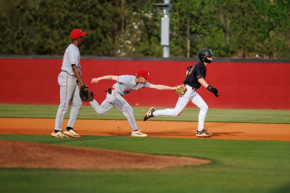 Forsyth Central's Carson Brewer tags out Lambert's Jack Petrofski during a Region 6-6A matchup Friday in Suwanee. (Photo by Jay Rooney Photography)