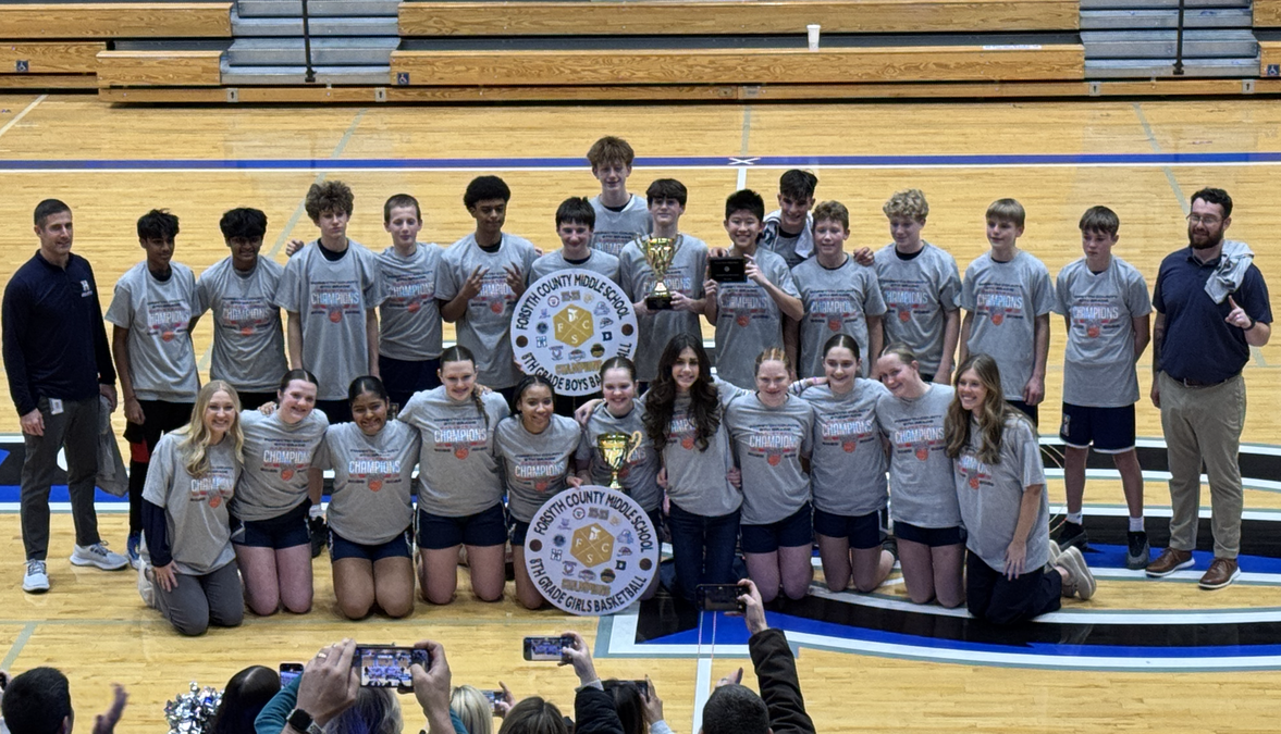 The Hendricks boys and girls basketball teams pose with the Forsyth County eighth-grade tournament championship trophies Thursday at South Forsyth High. (Photo by Nicholas Sullivan)