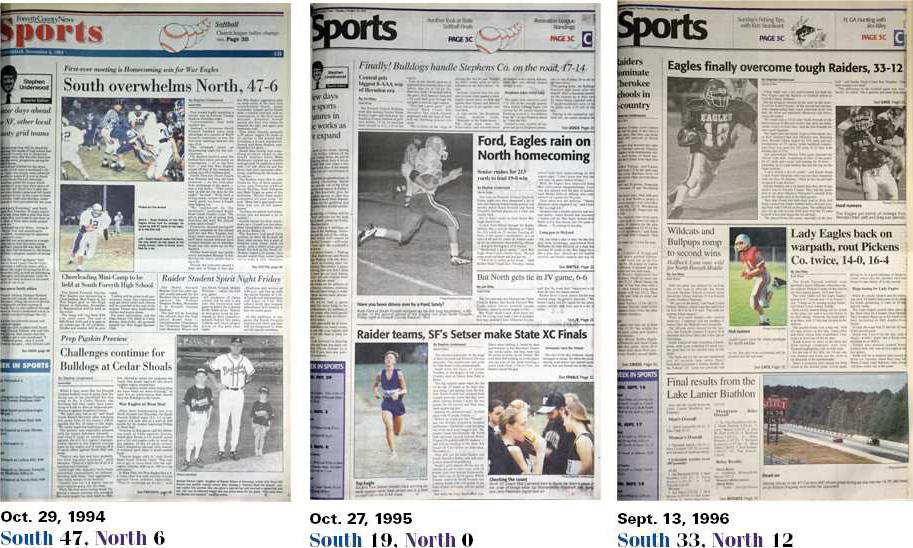 On Sept. 18, 1992, the first high school football game between two Forsyth schools was played at Forsyth Central, which previously played 38 years on the gridiron as the lone wolf in the county. The Bulldogs, led by coach Phil Knight, invited in the South Forsyth War Eagles, who were in just their fourth year of existence under head coach Charlie Cryer. The game ended in a 14-14 tie; nevertheless, a county rivalry was born.